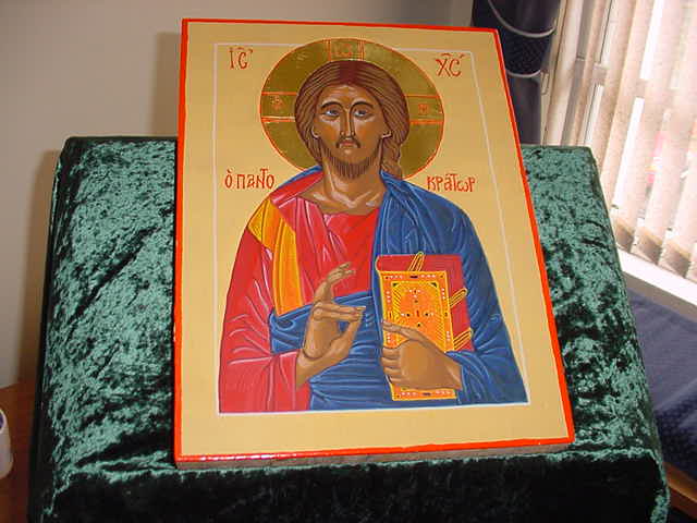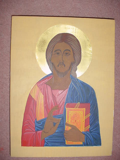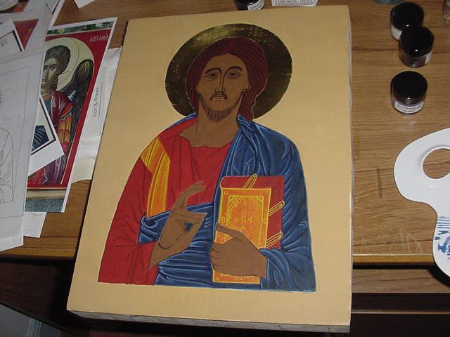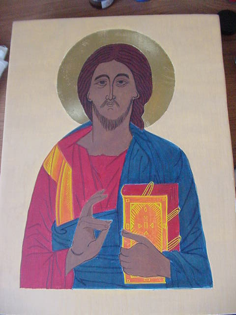 Find on this page a picture of an icon on which we are presently working. At this stage there is still a considerable amount of work to be done with highlights on all the garments, hair and flesh. As the work progresses we will update this page so that you will note the different stages. The only part presently highlighted is the orange band and part of the bible.